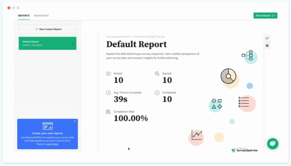 SurveySparrow’s voice of customer software comes with a rich dashboard that captures customer data real-time. When your respondents hit the submit button, the responses are entered in the analysis module instantly. Discover deep insights and gain new perspectives as